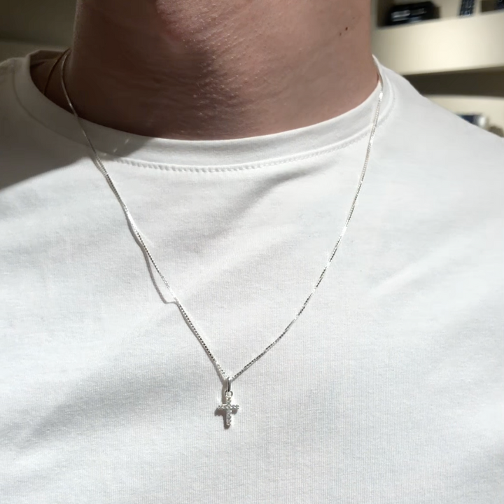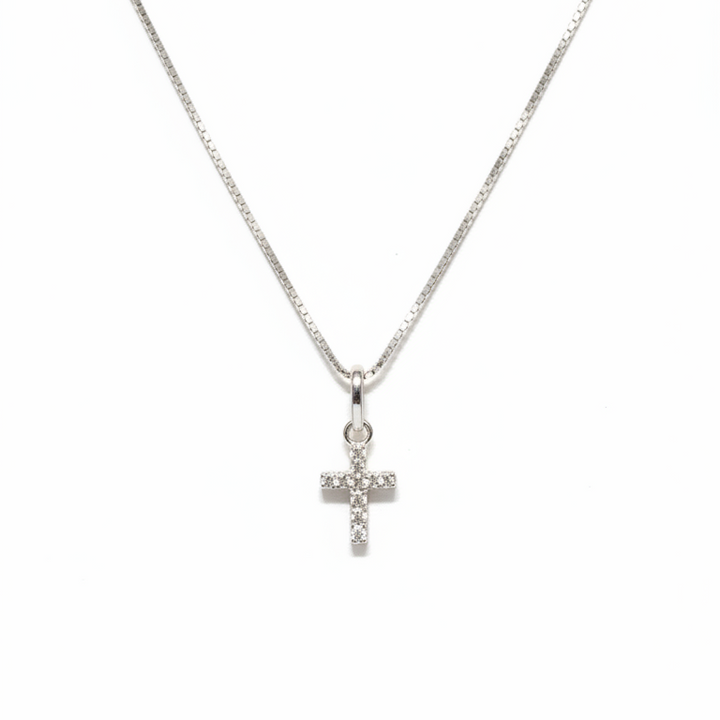 Eleva o básico com um detalhe que brilha. Este colar de cruz em Prata 925 traz zircônias cravejadas em micro-pavê para um brilho limpo e elegante — perfeito para usar no dia a dia ou como ponto de luz no look.