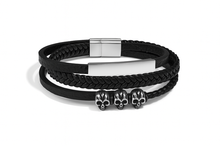 Pulseira de Couro Caveiras em Aço