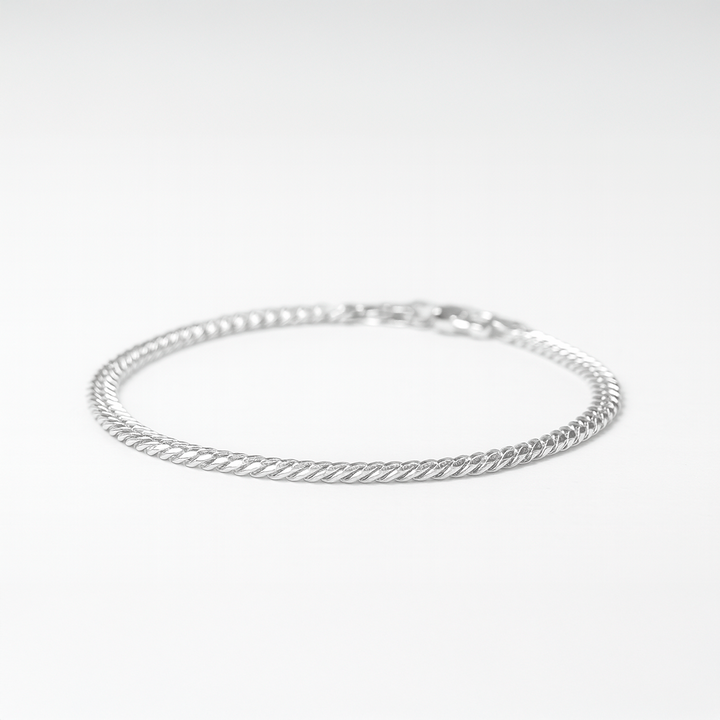 Pulseira Grumet Compacta em Prata 925 — elos planos e ajustados, brilho limpo e caimento firme. Discreta, resistente e unissex. Use solo ou combinada com outras pulseiras.